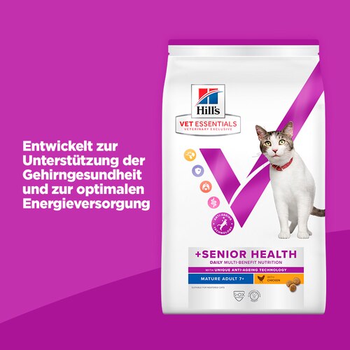 > >Hill's Vet Essentials MULTI-BENEFIT + Senior Health Mature Adult 7+ Katzenfutter mit Huhn > ist exklusiv in Tierarztpraxen erhältlich und ist ein Alleinfuttermittel mit mehreren Vorteilen für ältere Katzen ab 7 Jahren, das zur Unterstützung des Gehirns und des Körpers im Alter entwickelt wurde. Es liefert einen exakt ausgewogenen Nährstoffgehalt an Energie, Protein, Vitaminen und Mineralstoffen. Nicht künstlich konserviert. Keine synthetischen Farbstoffe. Keine künstlichen Aromastoffe.